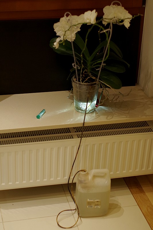 Podlewanie storczyka oznacza ni mniej ni więcej, że roślinie trzeba dać się napić. W tym celu należy na kilkanaście do kilkudziesięciu minut zamoczyć korzenie w wodzie. Wszystko jedno czy nalejesz wody do osłonki, czy włożysz doniczkę do wody w zlewie, wannie lub misce (z różnymi wersjami się spotkałem). Po wspomnianym okresie czasu, storczyka należy z wody wyjąć lub pozbyć się jej nadmiaru z osłonki. W sytuacji gdy roślina nie kwitnie nie jest to skomplikowane. Jednak gdy storczyk kwitnie obficie, a w szczególności gdy ma więcej niż jeden pęd kwiatowy, podczas przenoszenia istnieje spore ryzyko uszkodzenia kwiatów. Aby tego ryzyka uniknąć najlepiej w ogóle rośliny nie ruszać. Po zalaniu osłonki wodą i odczekaniu czasu, w którym storczyk pije, między doniczkę a osłonkę należy wetknąć wąski silikonowy wężyk stosowany w akwarystyce (do kupienia w każdym sklepie zoologicznym) i zassać wodę np. przy użyciu strzykawki - tu znajdziesz schemat takiego podlewania storczyka. Tym sposobem podlewanie storczyka odbywa się bez najmniejszego ruszania rośliny, a w osłonce, na dnie której często znajdują się przerośnięte korzenie, nie pozostają resztki wody. Dzięki temu nie martwisz się ani o kwiaty w trakcie podlewania, ani o kondycję korzeni już po zabiegu.